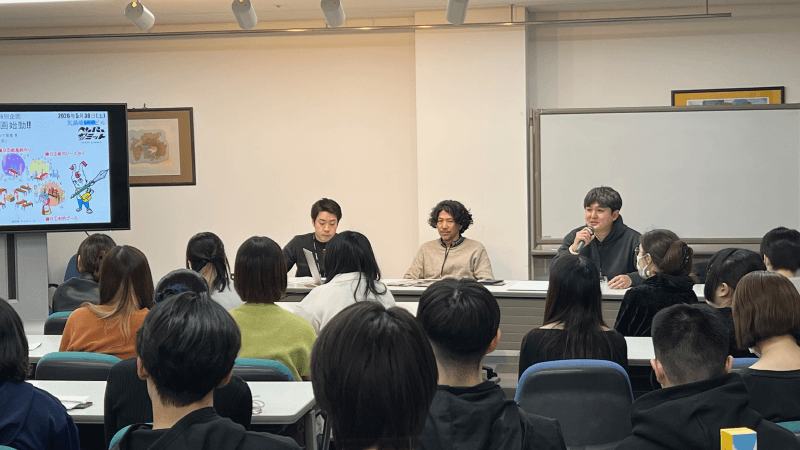 専門学校の生徒たちに企画のプレゼンをする中北さん